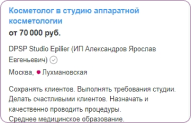 2016-2019 г. - Центр красоты и здоровья "Белла", врач-косметолог; салон красоты "Тайя", Косметолог